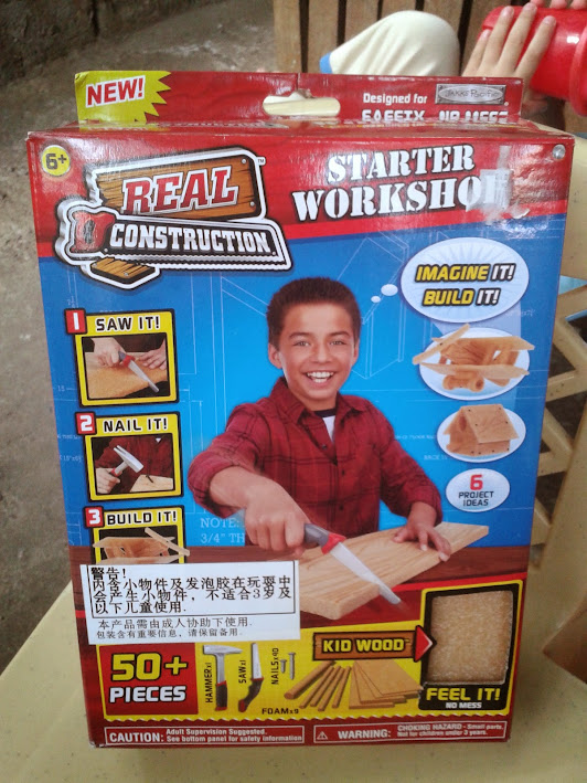 Few weeks ago, while scouting for a gift for Angie's friend's son I found this one toy that I find amazing. Amazing in a sense that kids will enjoy doing the construction thing using tools in a toy version. It got different kinds and shape of woods, hammer, and a mini saw. What's even great is that it has some suggestive things to make in which kids will have to figure it out how to make it. The process makes the kids imaginative and will also learn to value the work of the construction workers.
